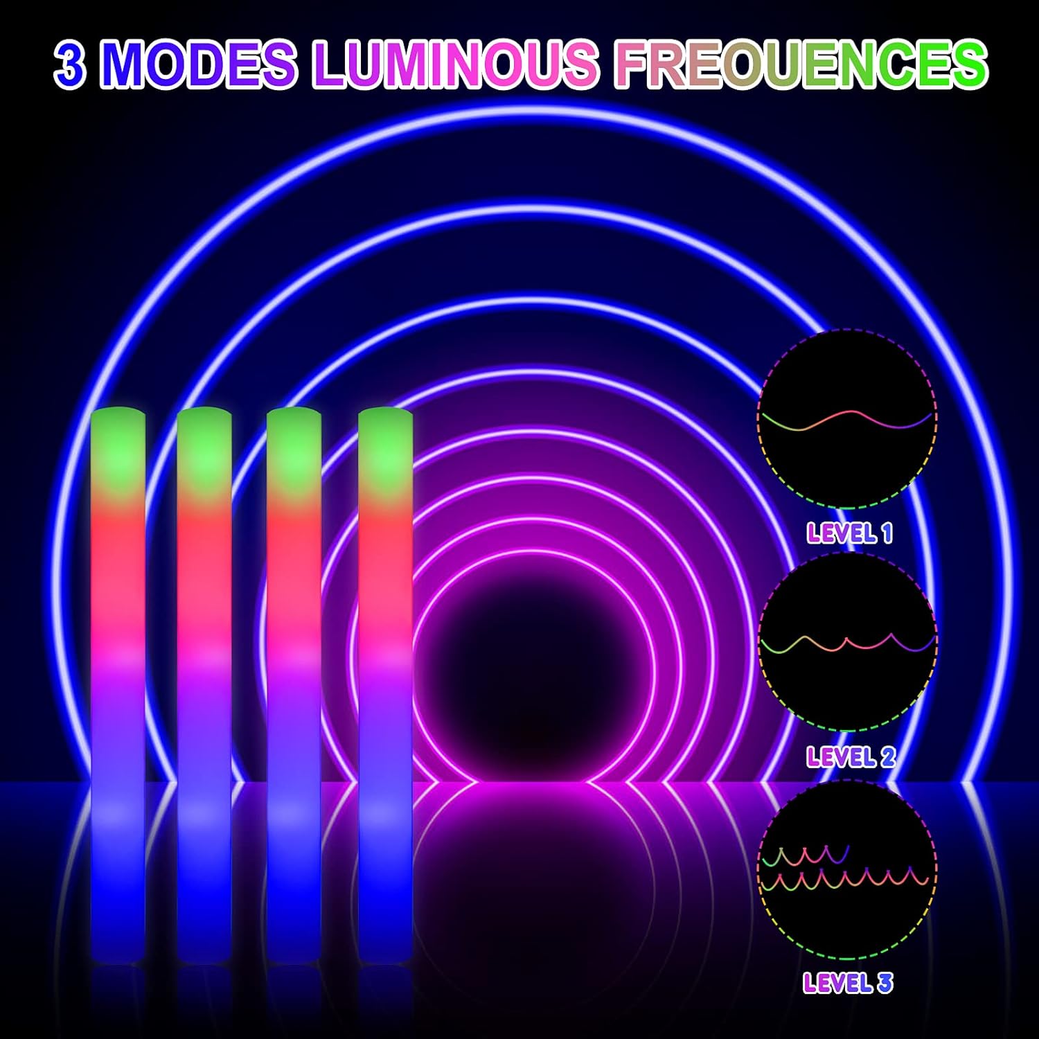 - 30pcs Glow Foam Sticks with 3 Flashing Modes: Press power button to switch between 3 different light up modes Quick flashing, Slow flashing, Alternately flashing in green red blue 3 light color
