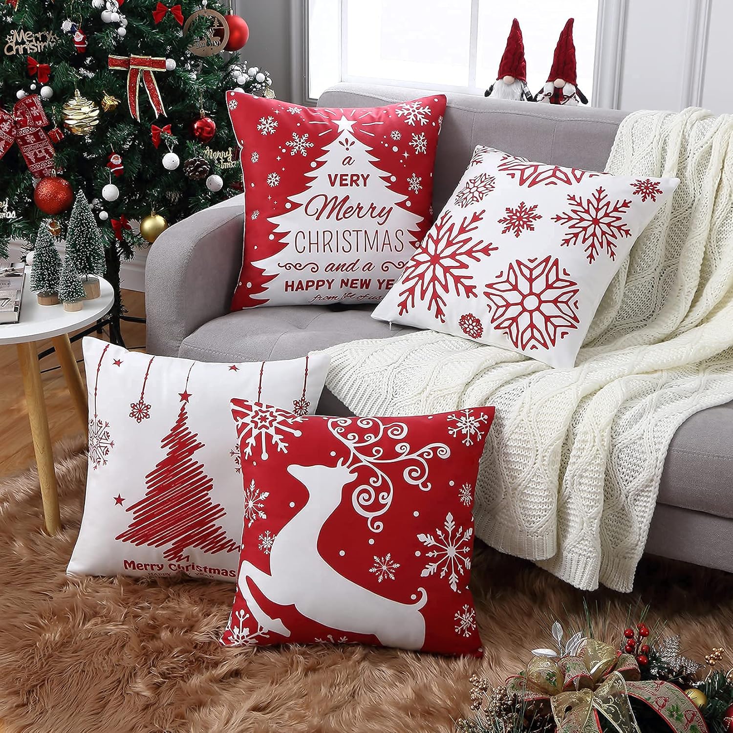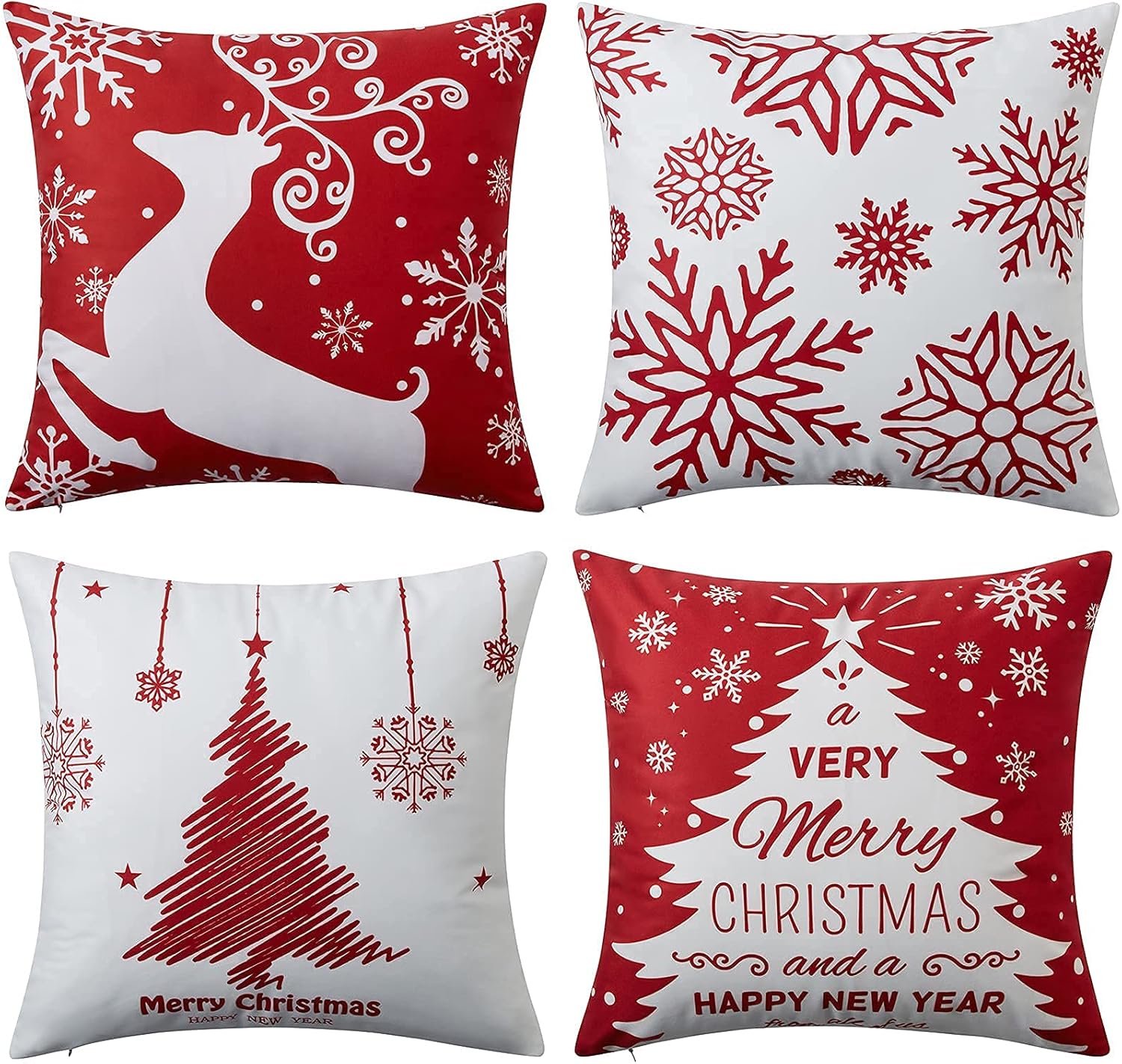 - ☃【CHRISTMAS DECORATIONS】 The Set of 4 Red Xmas Decorative Pillow Covers are designed with full of Christmas elements, such as Reindeer, Snowflake, Xmas Trees, "Merry Christmas", "Happy New Year" and etc, rendering a strong Christmas festival atmosphere.