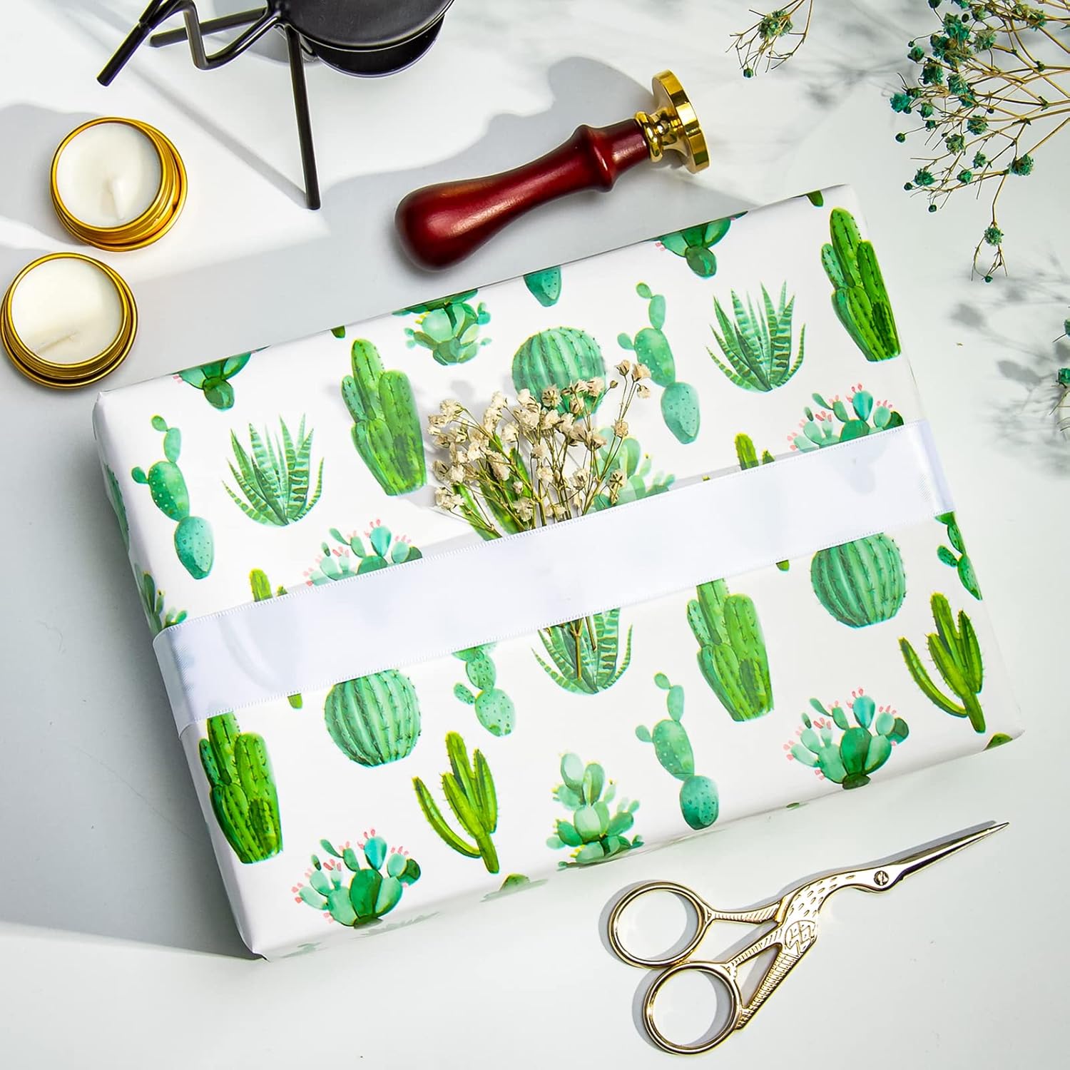 - REVERSIBLE: Watercolor cactus printed on one side, solid green printed on the reverse. Two different designs make unique and varied gift presentations easy