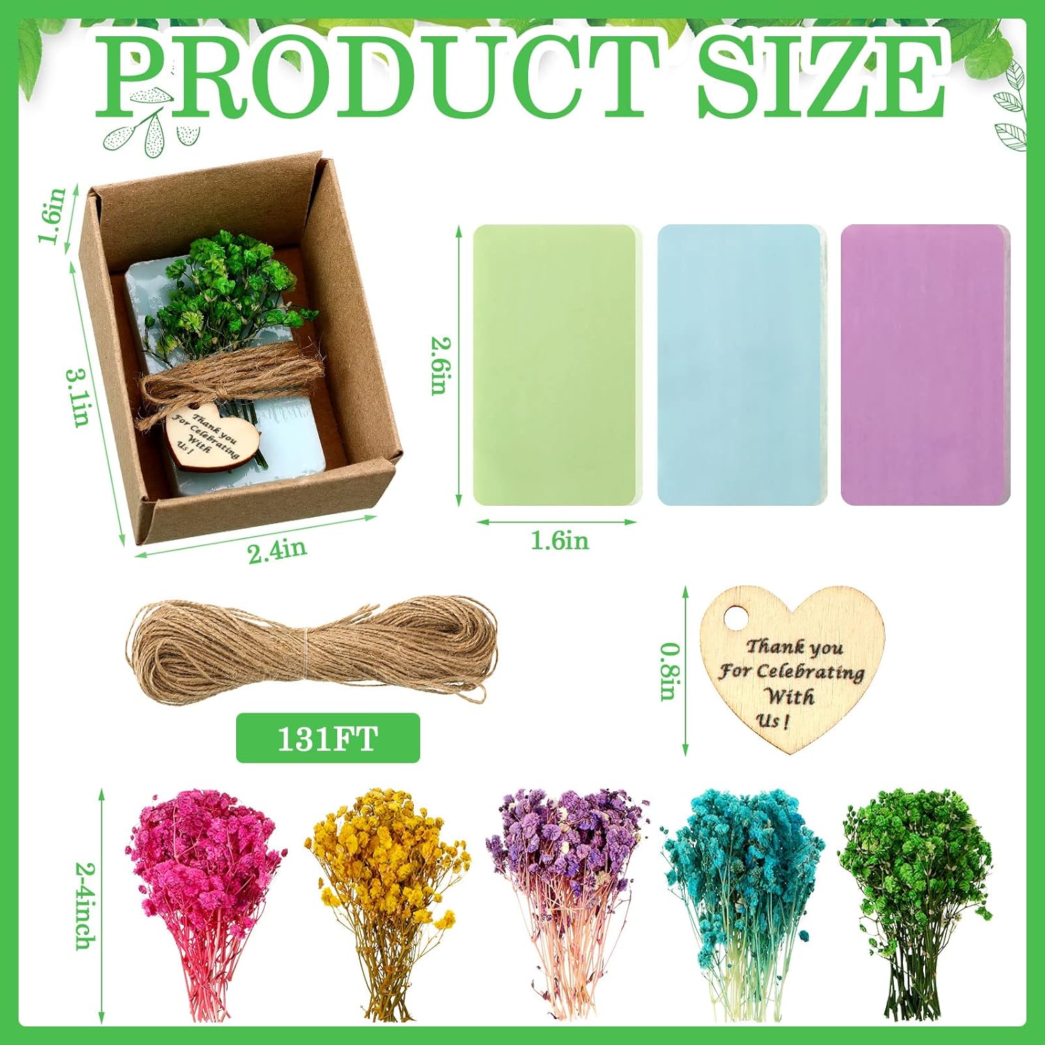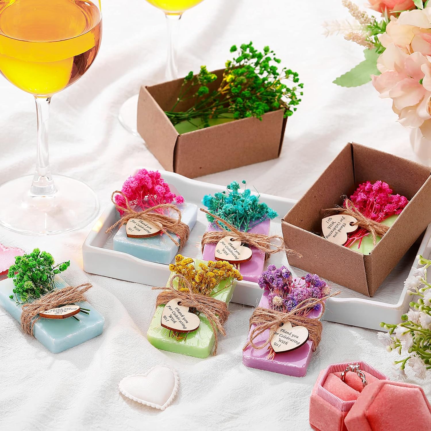 - Enough to Meet Your Needs: you will receive 45 pieces of baby shower soap favors in blue, green and yellow, 45 pieces of brown paper boxes with lids, 100 pieces of dried flowers with branches in pink, blue, yellow, purple and green, 1 roll of twine rope, 45 pieces of love shaped wooden labels, printed with words [thank you for celebrating with us; A complete and considerate combination to meet your various needs