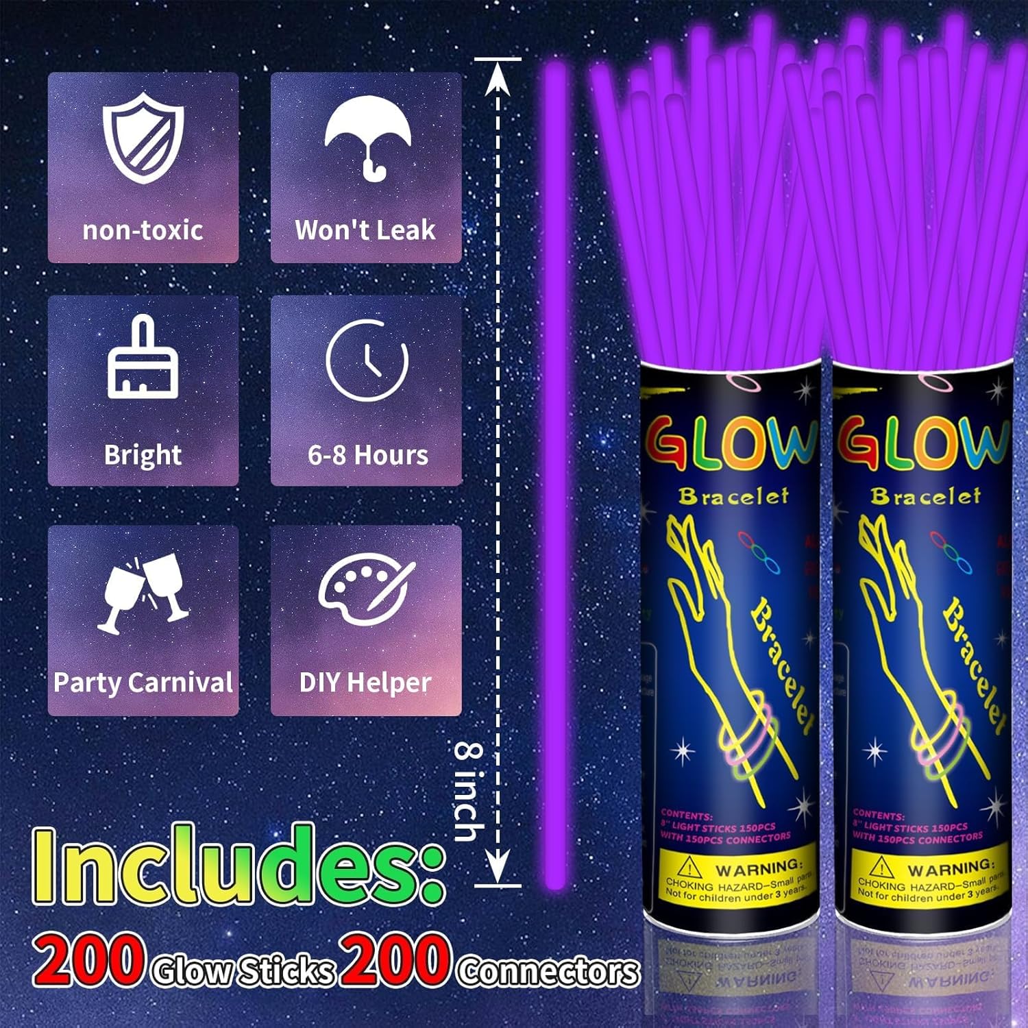 200 Pack 8'' Glow Sticks Bulk Party Favors Purple Light Up Sticks with Connectors Neon Glow in the Dark Party Supplies Bracelets for Holiday Birthday Party Decoration(Purple)