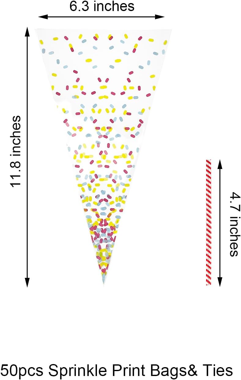 EKAPACKAGING 50Pcs 6.3x11.8 Inches Sprinkle Print Cone Shaped Treat Cellophane Bags Twist Tie Triangle Christmas Party Favor Cotton Candy Bags With Ties For Popcorn, Chocolates, Ice Cream Cone