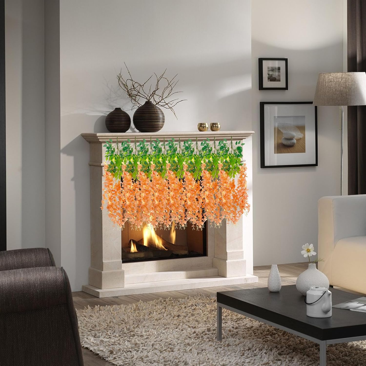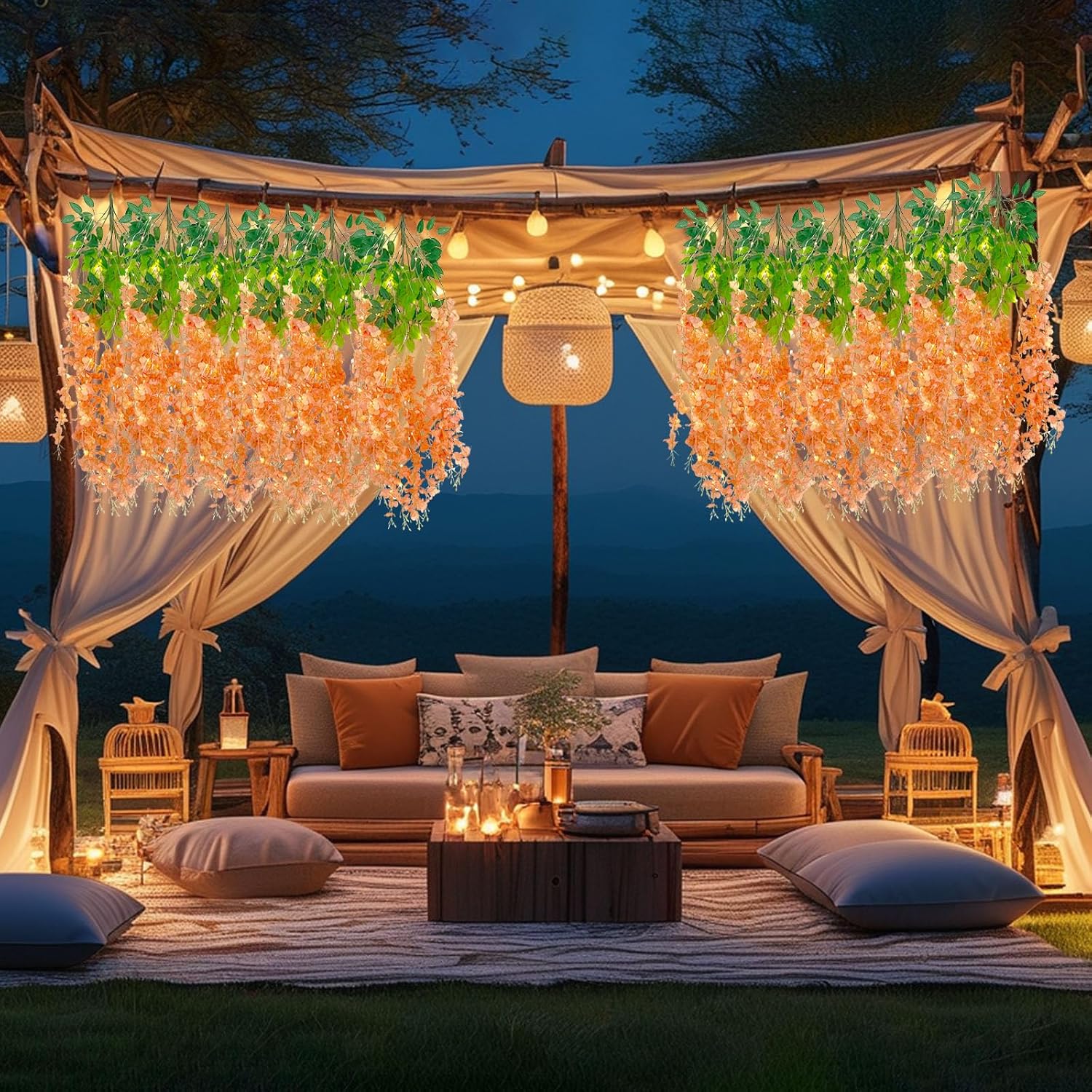 - 【Package Included】12 pieces of silk orange wisteria hanging flowers, each length 41.27 inches. Every artificial wisteria garland has 3 branches and 6 leaves, the wisteria flower petal length is 21.62 inches. It also comes with a warm light string that requires 2 AA batteries (Note: There may be some color differences in different lights, product not include batteries)
