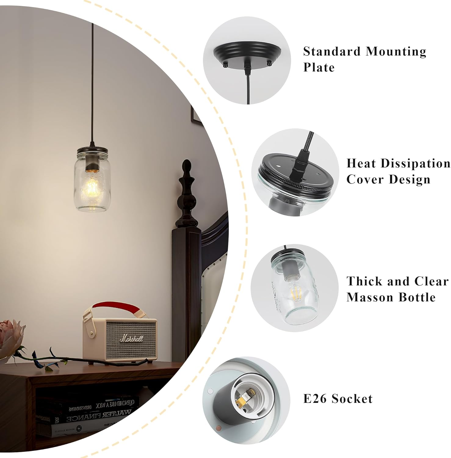 - Classic Mason Jar Pendant Light: The 1-light farmhouse pendant light with black finish and clear glass shade emits ample glow to light up the whole space. This mini black pendant light is perfect for a variety of decor styles ranging from vintage industrial to modern farmhouse, especially for kitchen islands, bedrooms, living rooms, dining rooms, sinks, hallways, etc.