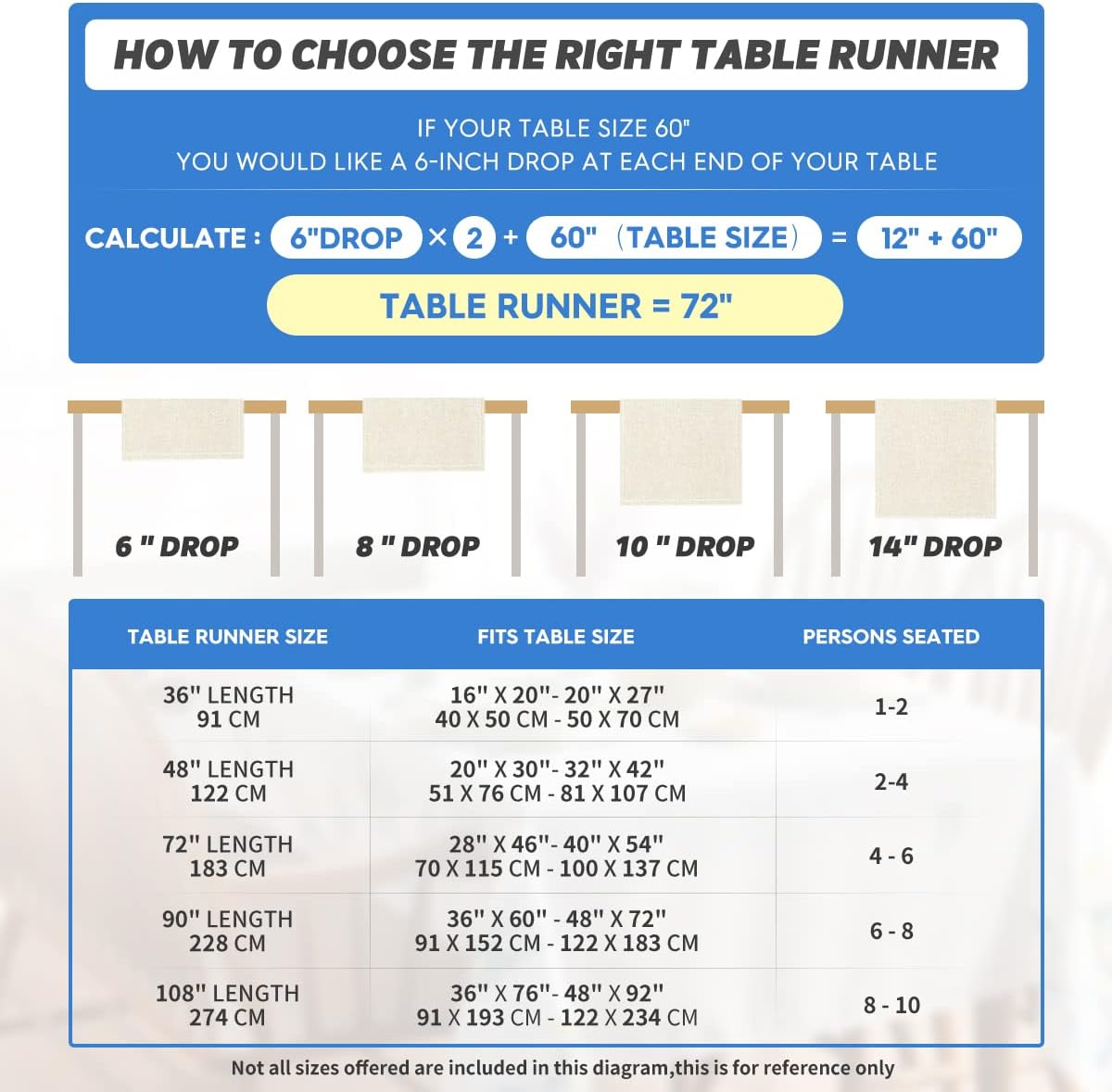 - Fits Table Size : This table runner is 12 x 72 inch, appropriate for a table that can seat 4-6 people, better match your table and give you a delightful dining experience