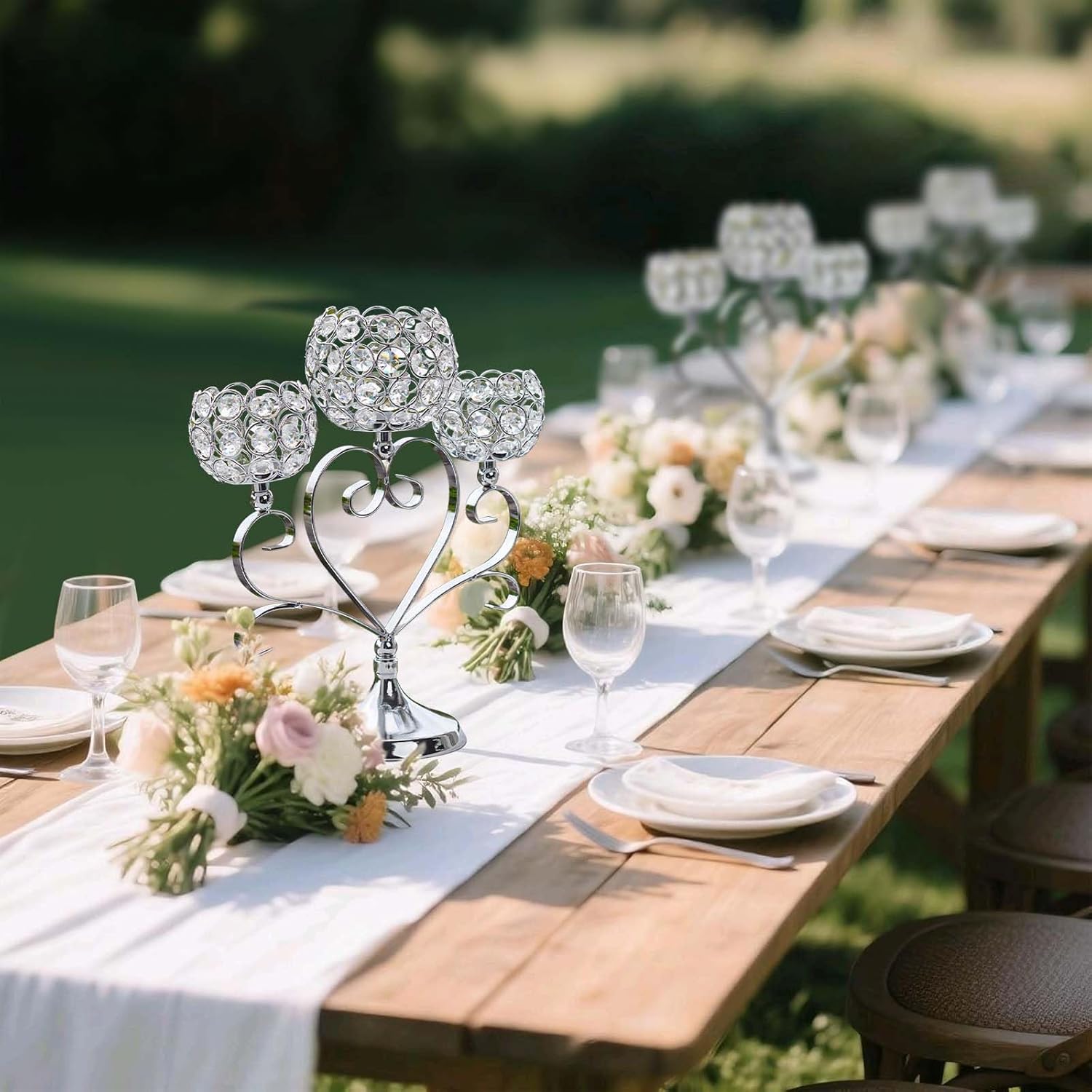2 Pcs 3-Arm Heart Tea Light Candle Holder - Crystal & Metal Wedding Centerpiece Decor, Sparkling Table Decor for Anniversaries/Romantic Tabletop Home/Dinner Party/Events (2, Silver)