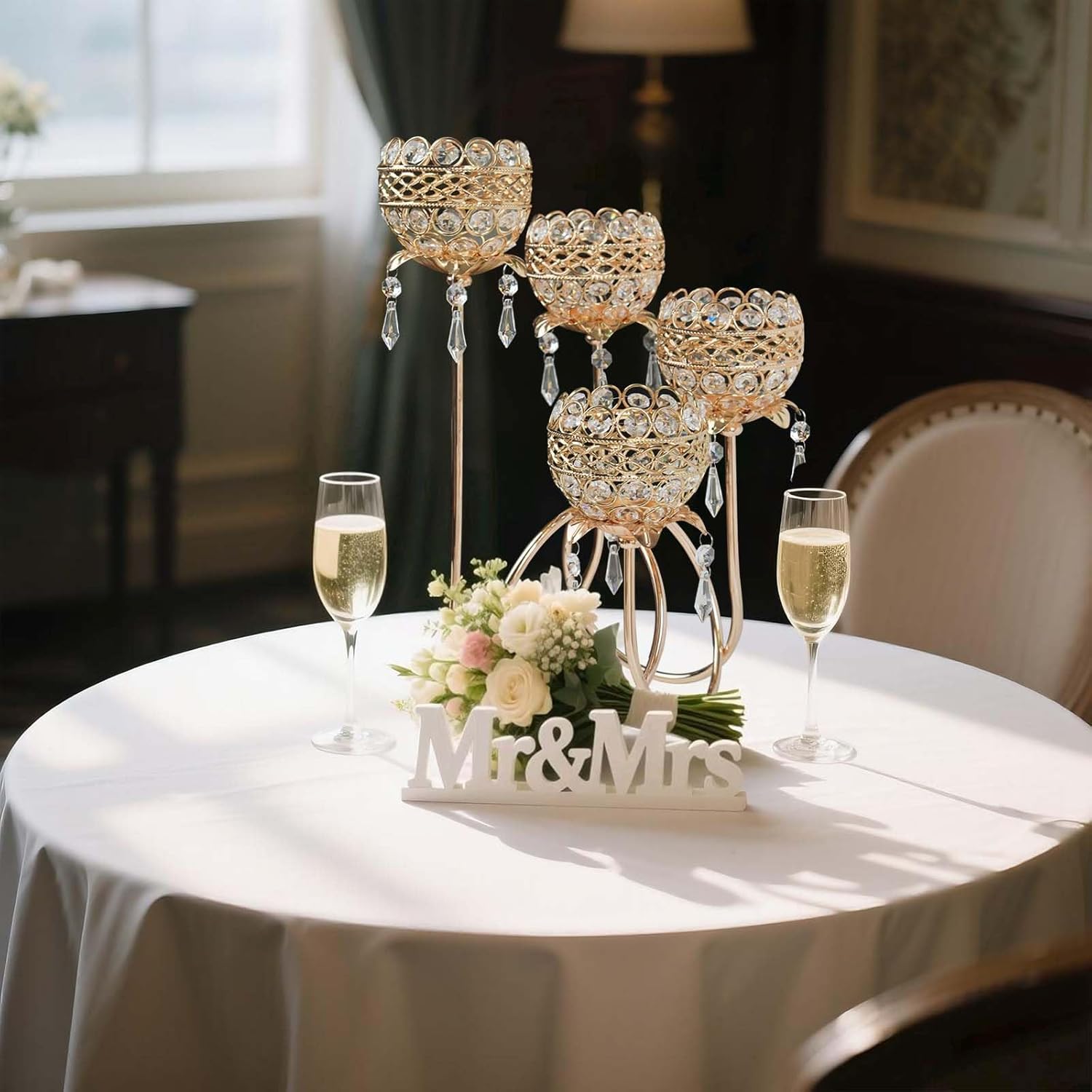 4 Arms Crystal Candelabra Tealight Holder - Tall 15.7 Inch Elegant Centerpiece with Crystal Pendant Bowls & Artistic Metal Stand for Wedding, Dining Table, Home Decor (1, Gold)