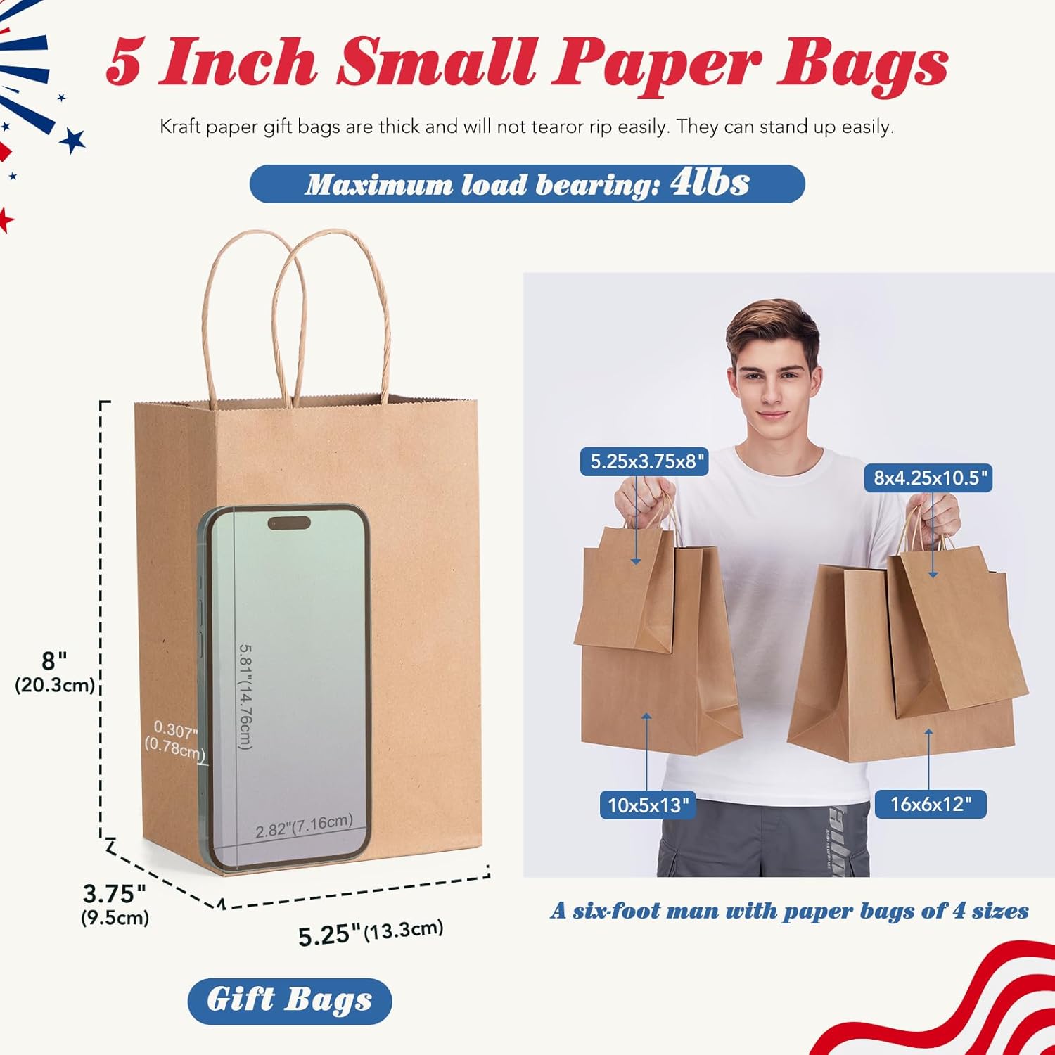 - GSSUSA Small Gift Bags: Brown paper bags with premium 100 GSM kraft paper. Craft bags with sturdy twisted handles support up to 4 pounds. Gift bags with handles feature reinforced box-shaped bottoms for durability. Thick paper gift bags have smooth surfaces with no stray glue residues